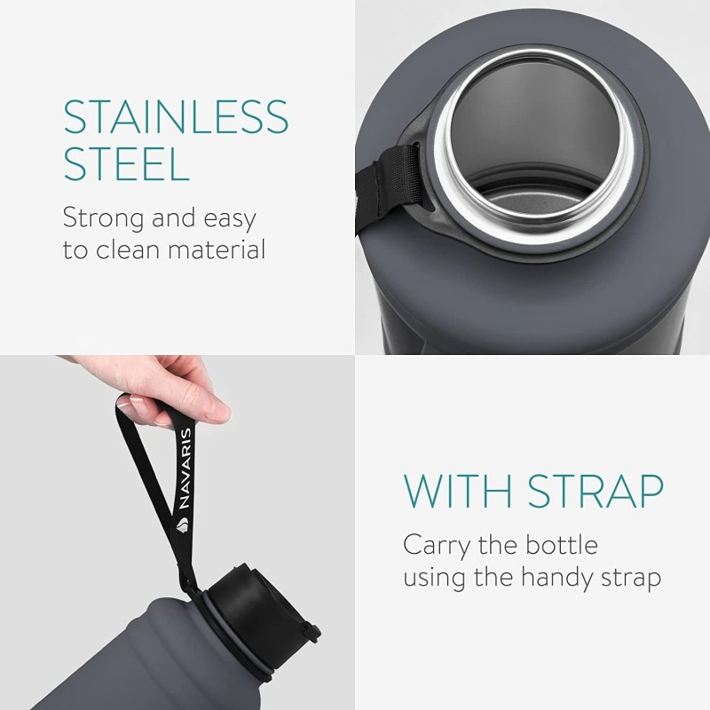 Μείνετε πάντα ενυδατωμένοι κατά τη διάρκεια της μέρας ή της προπόνησης σας με το μπουκάλι νερού της Navaris. Το μοντέρνο και υπέροχο μπουκάλι είναι εύχρηστο χάρη στο χερούλι του και εύκολο στη μεταφορά χάρη στο πρακτικό λουράκι του. Μεταφέρεται εύκολα και σας συνοδεύει παντού, τόσο στο γυμναστήριο όσο και σε μια πεζοπορία χάρη στο χερούλι που διαθέτει. Εκτός από την εύκολη μεταφορά, το χερούλι σας επιτρέπει να γεμίζετε και να αδειάζετε εύκολα το μπουκάλι κατά τη διάρκεια της προπόνησής σας. Το καπάκι του προσφέρει ασφάλεια ώστε να μπορείτε να το έχετε μέσα στην τσάντα σας, στο γυμναστήριο, πάνω στο γραφείο σας όσο εργάζεστε ή διαβάζετε, χωρίς να ανησυχείτε για το εάν θα υπάρξει διαρροή. Κατασκευασμένο από ανθεκτικό ανοξείδωτο ατσάλι, το μπουκάλι εντυπωσιάζει με τον ισχυρό και απλό σχεδιασμό του. Σε αντίθεση με άλλα υλικά, το ανοξείδωτο ατσάλι προσφέρει μια εξαιρετική ισορροπία αντοχής και άνεσης στη μεταφορά. Κατασκευασμένο χωρίς BPA, αυτό το επαναχρησιμοποιήσιμο μπουκάλι είναι φιλικό προς το περιβάλλον και θα γίνει το αγαπημένο σας αξεσουάρ για πολλές προπονήσεις. Είτε κατά τη διάρκεια της προπόνησης στο γυμναστήριο είτε κατά τη διάρκεια της προπόνησης στο σπίτι, με αυτό το μεγάλο μπουκάλι εξοικονομείτε χρόνο χωρίς να συμπληρώνετε νερό συνεχώς. Διαθέτει χωρητικότητα 2,2 L έτσι ώστε να μη χρειάζεται να το αναπληρώνετε συχνά. Μπορείτε επίσης να χρησιμοποιήσετε το μπουκάλι για χυμούς, smoothies, συμπληρώματα διατροφής και άλλα!
