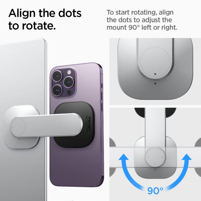 Η S312 OneTap MagFit Monitor / Laptop Magnetic Mount της Spigen, είναι μια μοναδική αυτοκόλλητη βάση με ενσωματωμένους μαγνήτες MagSafe, η οποία έχει σχεδιαστεί για να στερεώνεται σε laptop και είναι ειδικά κατασκευασμένη για τα αγαπημένα σας MagSafe κινητά όπως τις σειρές iPhone 15, 14, 13 και 12. Η βάση τοποθετείται με ασφάλεια στον φορητό υπολογιστή σας ή την οθόνη σας, μέσω της αυτοκόλλητης ταινίας 3M VHB. Ο εργονομικός του σχεδιασμός σας επιτρέπει να προσαρμόζετε τη γωνία θέασης και να περιστρέφετε εύκολα το τηλέφωνο ανάλογα με τις ανάγκες σας, ταυτόχρονα διπλώνει για την εύκολη μεταφορά του. Η βάση στήριξης τηλεφώνου για φορητό υπολογιστή S312 MagFit απλοποιεί τη ροή εργασίας σας. Εκτελέστε πολλές εργασίες με το iPhone σας δίπλα ή πάνω από τον φορητό υπολογιστή σας, χωρίς να κοιτάτε κάτω, ώστε να έχετε μία εργονομική προβολή. Κατασκευασμένη από κομψό και λεπτό αλουμίνιο, η βάση S312 δεν είναι μόνο ανθεκτική, αλλά αποπνέει και μια premium αισθητική! Στηρίξτε εύκολα το τηλέφωνό σας βολικά πάνω στον φορητό υπολογιστή σας, μιλήστε σε βιντεοκλήσεις ή δείτε ένα ακόμη βίντεο. Με δυνατότητα ρύθμισης 90 ° αριστερά ή δεξιά και τοποθέτηση που σας επιτρέπει τόσο κατακόρυφο όσο και οριζόντιο προσανατολισμό, στο πλάϊ ή στο επάνω μέρος της οθόνης σας. Σημείωση: Συμβατό με συσκευές MagSafe χωρίς θήκη ή με θήκη που έχει ενσωματωμένο MagSafe. Εφαρμόστε την αυτοκόλλητη ταινία 3M VHB σε επίπεδη επιφάνεια και αφήστε τη με την βάση να κολλήσει καλά για 24 ώρες.