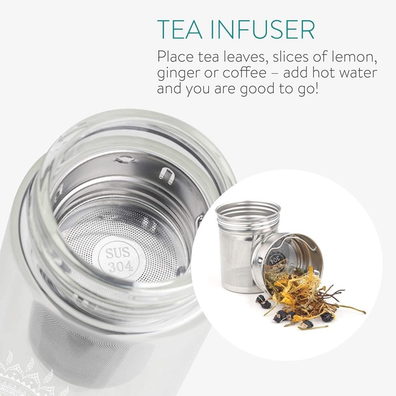 Τσάι, νερό ή καφές, πάρτε μαζί σας τα αγαπημένα σας ροφήματα με αυτό το κομψό μπουκάλι της Navaris, το οποίο διαθέτει και θήκη μεταφοράς. Είναι επίσης ιδανικό για να παρασκευάζετε τσάι στο γραφείο, καθώς διαθέτει ειδικό σουρωτήρι. Χάρη στο στεγανοποιητικό σιλικόνης που είναι ενσωματωμένο στο καπάκι, το περιεχόμενο παραμένει ασφαλές στο μπουκάλι. Μεταφέρετε τα ζεστά ή κρύα ποτά σας εν κινήσει με αυτό το πρακτικό διαφανές γυάλινο μπουκάλι. Είναι ιδανικό για τσάι καθώς και καφέ, χυμό, νερό ή άλλα ποτά. Είναι ανθεκτικό στη θερμοκρασία από -4 ° F έως 302 ° F / -20 ° C έως 150 ° C. Κατασκευασμένο από υψηλής ποιότητας μη τοξικό βοριοπυριτικό γυαλί, το γυάλινο μπουκάλι θα διατηρήσει τη φυσική γεύση τον φρούτων, βοτάνων κ.α., ενώ θα αποτρέψει την οξείδωση και θα παραμένει στεγανό. Το φίλτρο είναι κατασκευασμένο από ανοξείδωτο ατσάλι και το καπάκι από μπαμπού. Το φορητό και κομψό μπουκάλι, με ένα funky και μοναδικό σχέδιο, χωράει εύκολα σε μια τσάντα, ώστε να μπορείτε να το πάρετε μαζί σας εν κινήσει. Η θήκη από νεοπρένιο διαθέτει ενσωματωμένο λουράκι μεταφοράς από PU για ευκολία. Πάρτε το μπουκάλι μαζί σας και απολαύστε το ποτό σας στο σπίτι, στη δουλειά, στο κολέγιο, στο γυμναστήριο ή όταν ταξιδεύετε! Η συσκευασία περιλαμβάνει: 1x Μπουκάλι τσαγιού με καπάκι από μπαμπού, 1x Σουρωτήρι, 1x Θήκη από νεοπρένιο. Σημείωση: Μπορείτε να πλένετε το γυάλινο μπουκάλι με το σουρωτήρι στο πλυντήριο πιάτων. Το καπάκι από μπαμπού πρέπει να πλένεται στο χέρι. Για να μπορείτε να απολαύσετε το μπουκάλι τσαγιού σας για μεγάλο χρονικό διάστημα, να αποφεύγετε μεγάλες διαφορές θερμοκρασίας.
