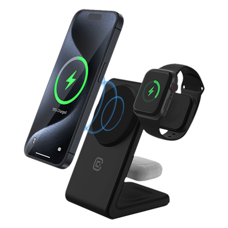 Ο φορτιστής MagSpot Pivot Stand της Crong είναι ένα απαραίτητο gadget για κάθε χρήστη Apple Watch, iPhone με MagSafe και AirPods με θήκη φόρτισης. Ο μινιμαλιστικός σχεδιασμός σας επιτρέπει να φορτίζετε ταυτόχρονα το Apple Watch, το iPhone σας και τα AirPods με θήκη φόρτισης. Έχει κλίση σε γωνία 27⁰, κάτι που σας επιτρέπει να ελέγχετε εύκολα όλες τις ειδοποιήσεις στο iPhone σας. Καταλαμβάνει επίσης λίγο χώρο, ώστε να χωράει σε οποιοδήποτε γραφείο ή κομοδίνο. Ο δακτύλιος MagSafe έχει επίσης ανυψωθεί για να διασφαλιστεί η συμβατότητα με όλα τα μοντέλα iPhone, ανεξάρτητα από το μέγεθος της κάμερας. Διαθέτει περιστρεφόμενο βραχίονα, ειδικά σχεδιασμένο για την φόρτιση όλων των Apple Watch, ώστε να εξοικονομεί χώρο όταν δεν το χρειάζεστε. Επιπλέον, σας δίνει την δυνατότητα να φορτίσετε το Android smartphone σας, με θήκη MagSafe ή μαγνητική πλάκα MagSafe με ισχύ 15W. Ο φορτιστής MagSpot Pivot Stand είναι σχεδιασμένος με τέτοιο τρόπο ώστε ο χρήστης να μπορεί να φορτίζει το iPhone του και σε κατάσταση αναμονής, (διαθέσιμο στο iOS 17). Η δυνατότητα φόρτισης σε οριζόντια λειτουργία είναι επίσης μια εξαιρετική λύση, όταν παρακολουθείτε την αγαπημένη σας σειρά στην οθόνη του smartphone σας. Επίσης, το σετ περιλαμβάνει ένα καλώδιο Type-C στο χρώμα του φορτιστή, ενώ η βάση του είναι αντιολισθητική και προστατεύει την επιφάνεια στην οποία βρίσκεται. Σας προσφέρει ισχύ 7.5W για το iPhone σας, 3W για το Apple Watch και 5W για τα AirPods. Σημείωση: Απαιτείται φορτιστής ρεύματος με θύρα Type-C, με ελάχιστη ισχύ 20W.