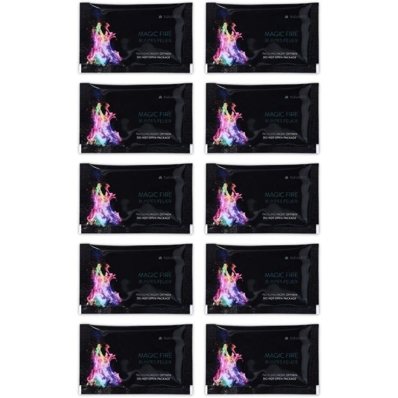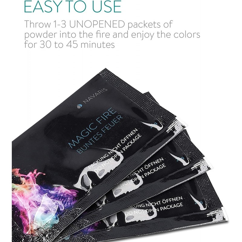 Με το Navaris Magic Fire, μπορείτε να δημιουργήσετε πολύχρωμες φλόγες στη φωτιά και να μαγέψετε ενήλικες και παιδιά με έναν μοναδικό και συναρπαστικό κόσμο χρωμάτων. Κάντε ακόμα πιο μαγικές τις νύχτες σας γύρω από τη φωτιά, με αυτά τα μοναδικά μαγικά πακέτα σκόνης! Περιέχουν σκόνη που μετατρέπει κάθε φωτιά που καίει σε ξύλο σε πολύχρωμες φλόγες. Ρίξτε 1-3 κλειστά πακέτα σκόνης στη φωτιά και απολαύστε τα χρώματα για 45 έως 90 λεπτά. Η συσκευασία σας περιλαμβάνει 10 τεμάχια, αρκετά για να απολαύσετε για αρκετές ώρες, όμορφες φλόγες ουράνιου τόξου. Μπορείτε να δημιουργήσετε μια μυστηριώδη ατμόσφαιρα στον κήπο σας, με αυτό το πρωτότυπο και εντυπωσιακό τρικ, έτσι το επόμενο πάρτι στον κήπο σας θα είναι σίγουρα μια επιτυχία! Είτε κάθεστε άνετα δίπλα στη φωτιά στο τζάκι σας, ή στον κήπο σας ή ακόμα και στο κάμπινγκ, με αυτή την σκόνη θα απολαύσετε μία μαγική βραδιά! Σημείωση: ΜΗΝ μαγειρεύετε φαγητό ή ψήνετε marshmallows στη φωτιά ενώ χρησιμοποιείτε τα πακέτα. Τα πακέτα περιέχουν ορυκτό αλάτι με βάση τον χαλκό και είναι εύφλεκτα υλικά που δεν είναι ασφαλή για κατανάλωση. Φυλάσσεται σε δροσερό, ξηρό μέρος όταν δεν χρησιμοποιείται. Να φυλάσσεται μακριά από παιδιά. Χρησιμοποιήστε το σε εξωτερικούς χώρους ή σε καλά αεριζόμενο εσωτερικό χώρο. Μόνο για φωτιές με ξύλα. Τα φακελάκια ΔΕΝ πρέπει να ανοίγονται εκ των προτέρων, αλλά να μπαίνουν στη φωτιά κλειστά! Τα πακέτα μπορούν να χρησιμοποιηθούν και σε σχάρα, αλλά στη σχάρα δεν πρέπει να έχετε τρόφιμα.